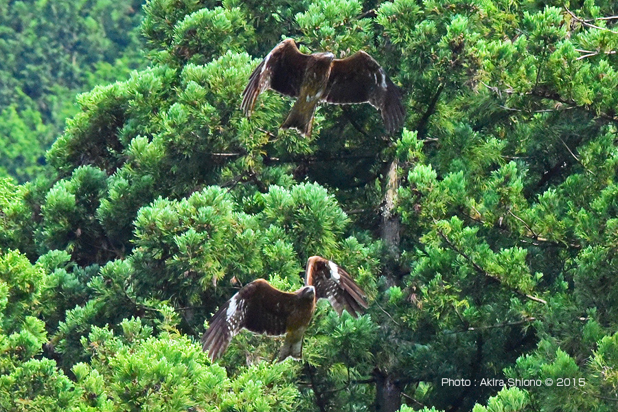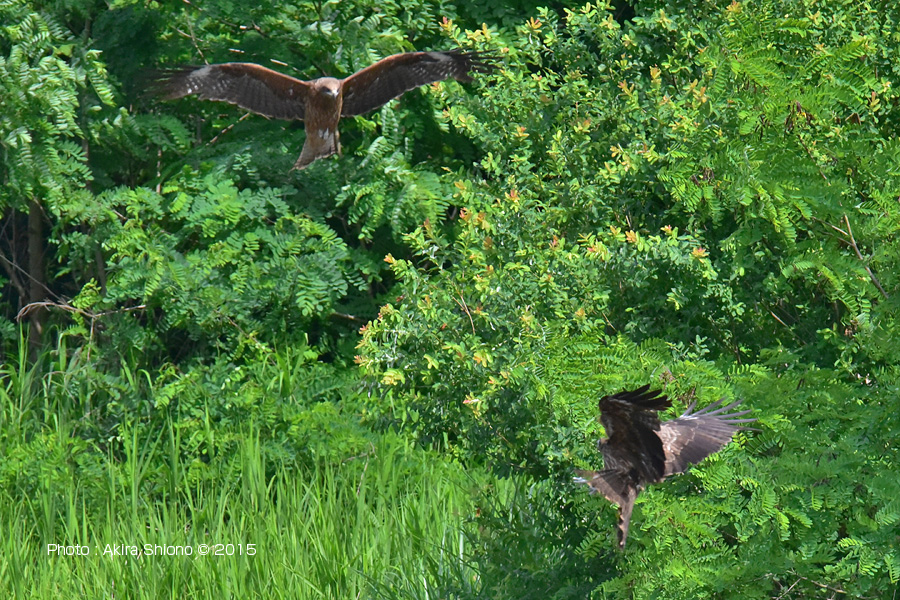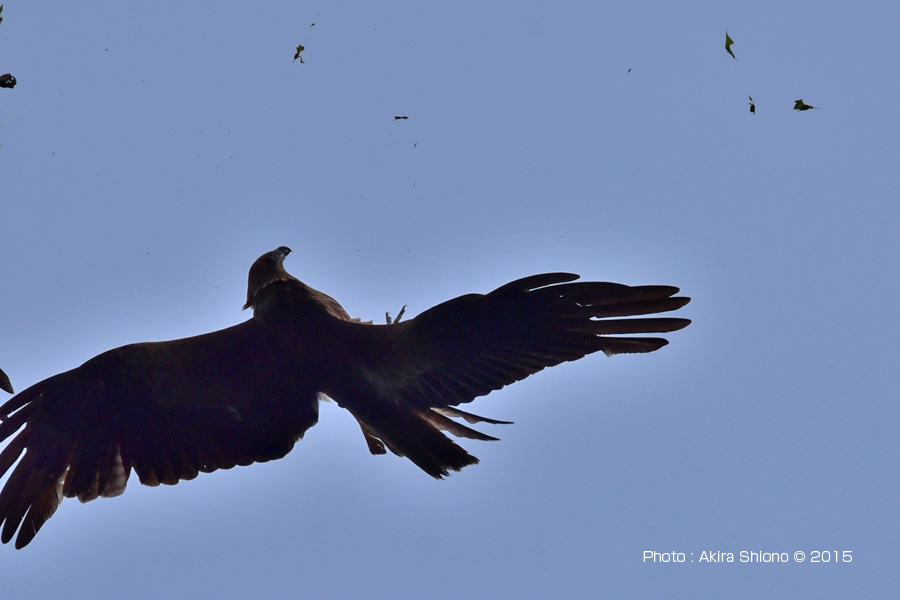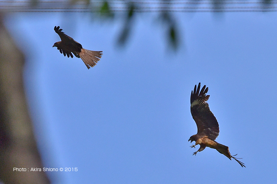 必死に実分のテリトリーを守るために追いかけます。前のトビは上下に飛行し振り切ろうとします。 ![]() 上空でトビ同士の空中戦が始まり、片方のトビの羽根が空中に散っています。