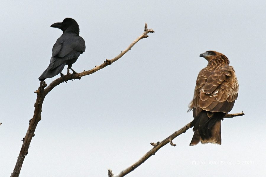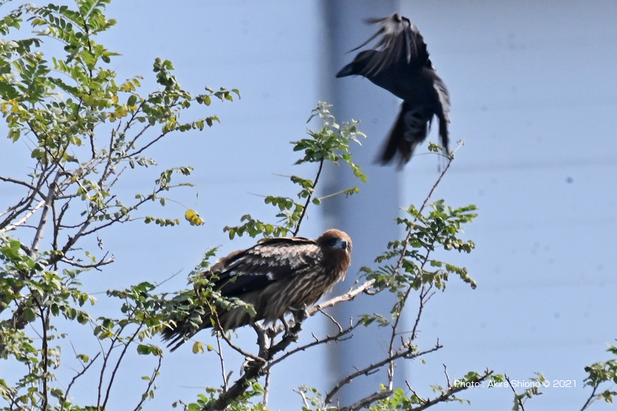 トビの若鳥が留まるとなりの枝にハシブトガラスがちょっかいを出しに来ました。