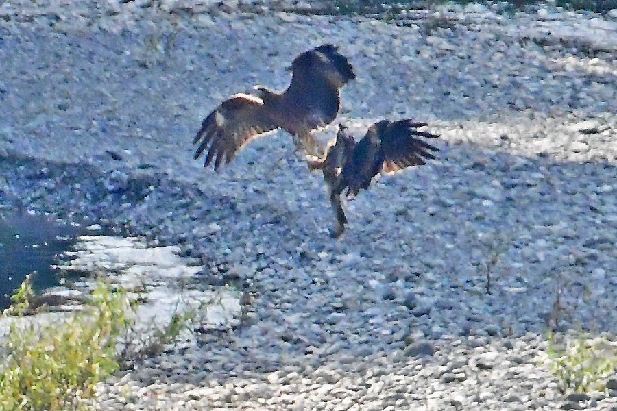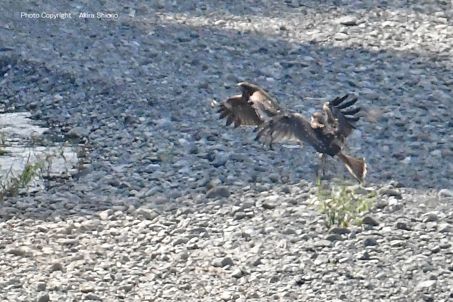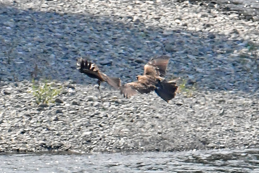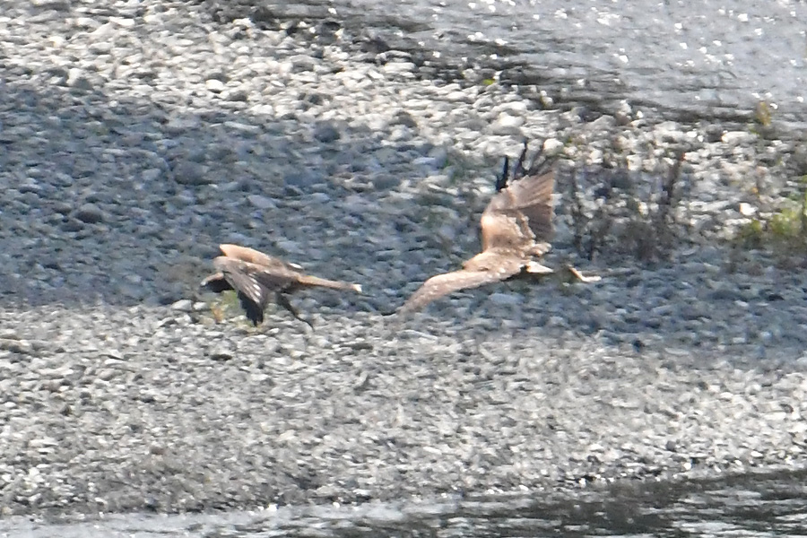 ![]() 前のトビがヘビをぶら下げ飛んでいます かなり追い回して、ついに中洲のあたりで追い付きました。