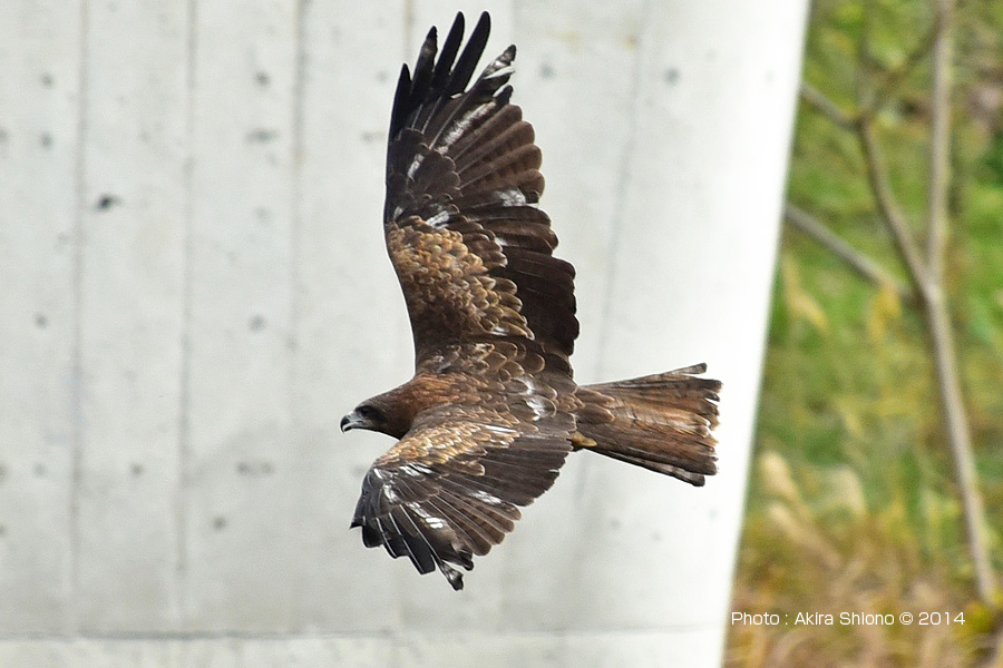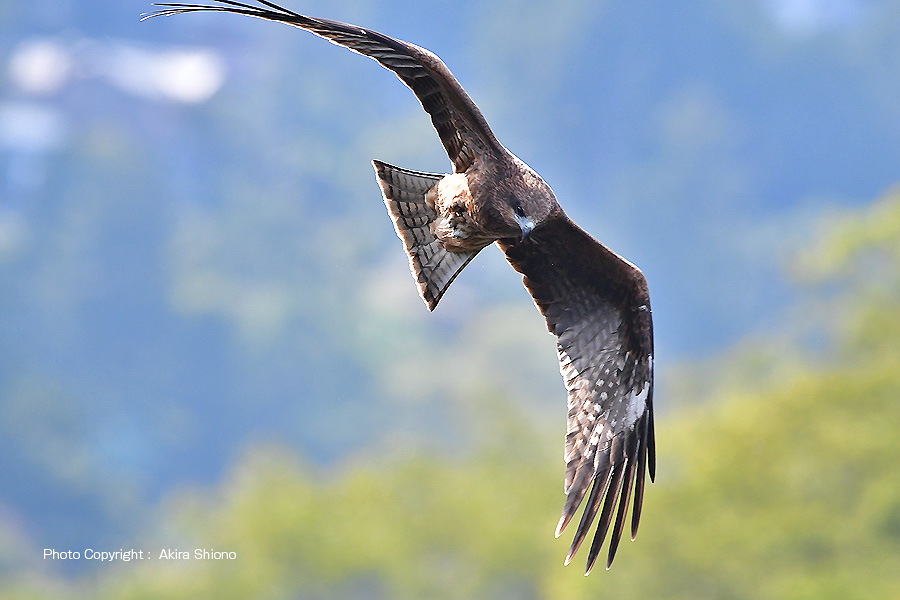 トビ(別名トビ)は、山や海辺の開けた自然の多い場所で見られます。しかし最近は自然の景色を求め人が、マンションなどが建設されて人間が自然に近づいて住んでいるので、トビは身近な猛禽類の野鳥となっています。上の写真は人の多い青梅の釜の淵公園で撮影したトビで、脇見しているとお弁当のおかずなどをサッと持っていかれる場合があるので、「ピーヒョロヒョロ」の様な鳴き声を聞いた時は、気をつけたほうがいいかもしれません。 捕まえた獲物を奪うトビ トップへ ![]() 上空から視力の良い目で餌を探す飛行姿を撮影したものです