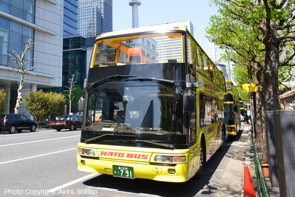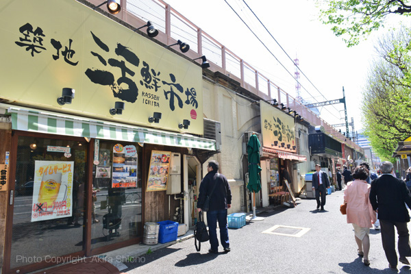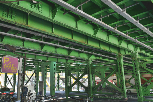 ![]() 線路に沿って南に進むとガードとお店。その道側にには、都内観光の『はとバス』の発着所があります。