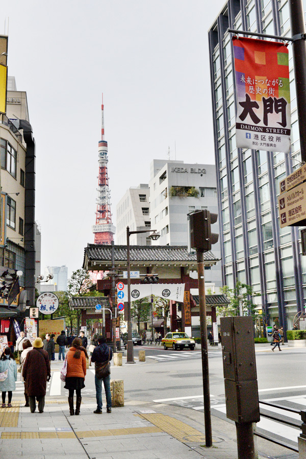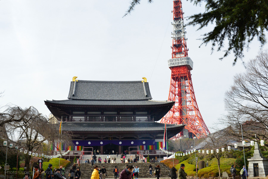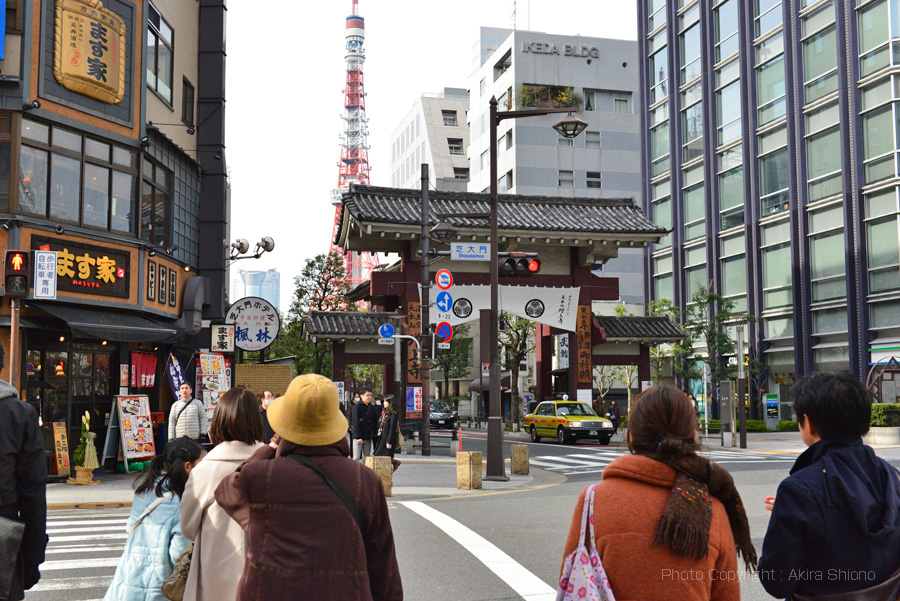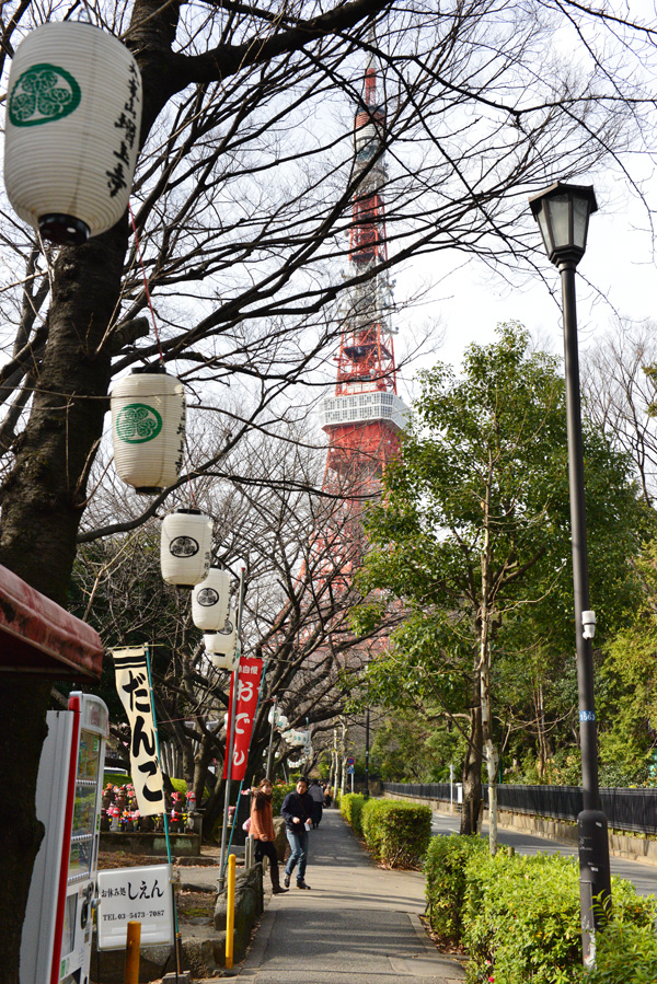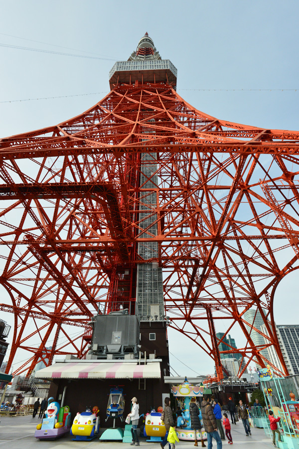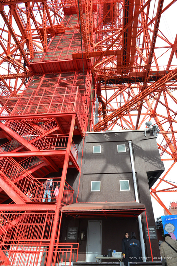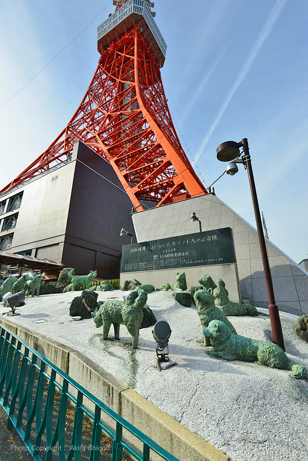 浜松町で電車を降り、まずは世界貿易センターからタワーの全景を見る事にしてみました。展望台料金(観覧券)は620円で、ここ浜松町の周辺がぐるりと見回わせます。最近は東京スカイツリーが観覧が予約なしで登れる日もあるそうなので、そのせいかゆったりと見る事ができました。しかし一方、東京スカイツリー人気で東京タワーの来場者も増えているとも聞きました。 一旦、門を戻り、傍の道を通ると桜の枝の間の真正面に東京タワーがそびえ立ちます。更に進むと“東京タワー前”信号に出ますが、ここからタワーまでの道は急勾配になっています。 東京タワーの足元 トップへ 東京タワーの脚の基礎には建設当時に観測船宗谷で南極に向い、極寒の現地で働いた 樺太犬の記念像があります。ここを通り過ぎタワー下部の建物フットタウンに入ります。 土産物店などは昭和の売店の雰囲気を残すものの、キャラクターのノッポンが新しい東京タワーのイメージキャラクターになるなど、新旧入り交じったところが歴史ある東京タワーの味になっています。 東京タワービル屋上 トップへ 東京タワーの地上部分にはフットタウンは1Fには、東京タワー水族館・サービスカウンター,イベント会場(2015.6.27現在:東京ワンピースタワー)。2Fには土産店・フードコート・飲食店街があります。3Fにはギャラリー・スポーツ施設・イベント広場・新聞社。4・5Fにはイベント広場があります。屋上には、大展望台直通階段があります。下の写真は屋上から上を見上げた写真です。地上150mの大展望台直通階段は590段あり、上った方にはノッポン公認の「昇り階段認定書」がもらえます。 東京タワーの料金東京タワー周辺/増上寺と芝公園 トップへ