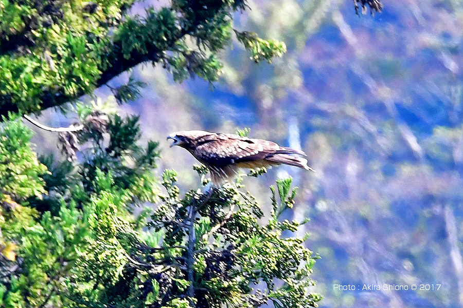 トビはタカ目タカ科に属する猛禽類で地域によりトビともいわれています。トビは留鳥で、生涯が終わる迄日本で過ごします。大きさは良く目にするカラスより大きく、翼を広げると1.6m位あるといわれています。 見晴らしの良い針葉樹の天辺で休憩 トップへ