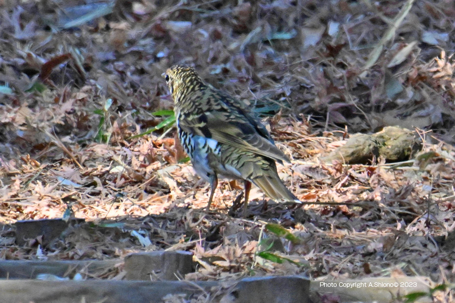 ![]() 遠くから見ると背景に溶け込んでいて、動かないと居場所がわかりません NIKON Z9+NIKKOR Z400mm f/4.5S+TC-20(1200mm相当) ISO 2500 1/1250 F10 0段 2倍トリミング 驚いて木の枝に移ったトラツグミ トップへ カモフラージュに近い柄のトラツグミに気付かず近づいてしまって、慌てて木の枝に飛び移ったトラツグミ。画像は逆光補正でトラツグミと分かりますが、最初は背景が明るすぎてツグミと思い込んでしましたが、そのうちに地面に降りて来てトラツグミと判明しました。そのうち何も無かった様に餌探しを始めました。 ![]() 地面にいたトラツグミに気付かず近寄って、枝に飛び移ったトラツグミ。逆光補正 NIKON Z9+NIKKOR Z400mm f/4.5 VR+TC-20(1200mm相当) ISO 2000 1/2500 F13 0段 1.5倍トリミング) 地面に降りて積もった落ち葉の下から餌を探すトラツグミ トップへ ![]() 落ち葉の斜面で見つけたトラツグミですが、餌を探している様です。 ![]() 顔を右方向へ向けて進むトラツグミ。 NIKON Z9+NIKKOR Z400mm f/4.5 VR+TC-20(1200mm相当 1/2500 F13 0段)