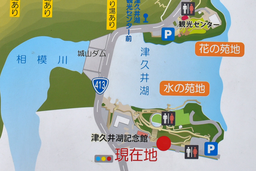 城山ダム周辺の観光地と津久井湖周辺の宮ヶ瀬湖と相模湖の地図