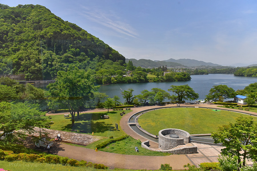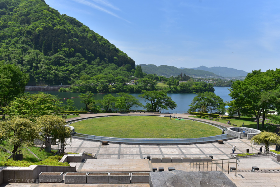 津久井湖記念館の湖側に広がる「水の苑地」で山の中に津久井湖が奥まで広がります。