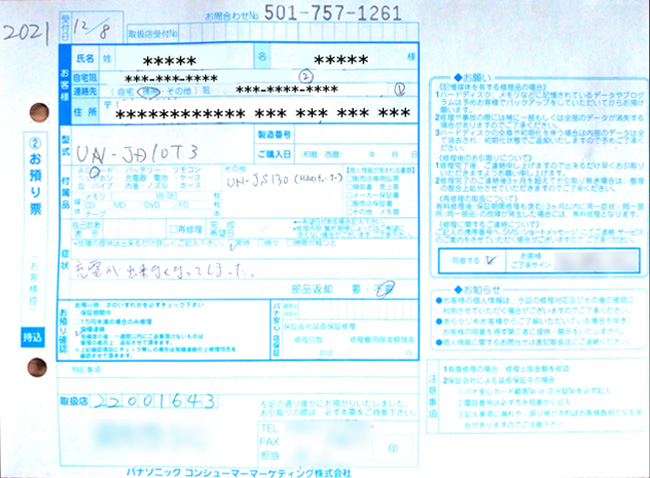 このディーガモニターは3代目で、購入してから6年半以上経っています。今迄バッテリー作動が出来ず行動範囲が限られ不便になっていました。この不便さ解消の為にバッテリー交換の件で、パナソニックサポートに相談しました。一応全体の検査をするとの事です。料金は結果がバッテリー交換のみで11,700円、基盤等の不具合があった場合部品交換が加わると17,820円とのことでのでした。2万円を超えると型落ち製品が買えるので基盤交換は難しい選択なので、見積金額を連絡してもらうことにしました。 バッテリー充電不能の修理内容 トップへ 修理窓口は、一般には家電店の修理受付です。しかし時期が12月だったこともあり出来るだけ早く修理完了して欲しいために、パナソニックのサービスステーションへ持ち込みすることにしました。修理日数は2週間程度ということで製品を預けましたが、運良く比較的早く修理完了の電話がきました。