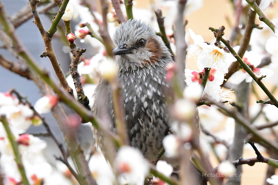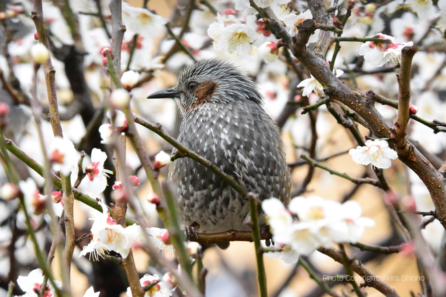 郊外では、日頃よく目にする野鳥です。大きさは28cm前後と野鳥では比較的大きめの部類で、メジロの12cm位と比べるとかなり大きさに差があります。 満開の梅の香りに誘われてやってきたヒヨドリ