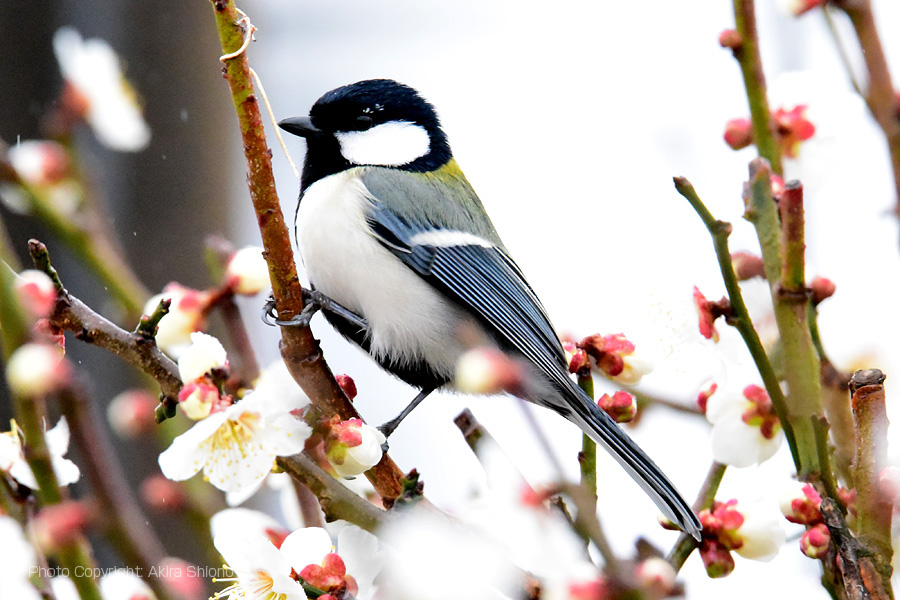 3月に入り寒暖を繰り返し、段々平均気温が上がり始めました。2月には枝についた小さく、たくさんの莟が目立ち始めました。3月に入ると寒暖の差も幅が広がり、最高気温が18℃を越える日があったり、10℃以下の日があったりでまさに『三寒四温』と云う日がやってきました。ふと花がポツポツと咲き出しました。庭にある梅の木の花が5分を越えるあたりに野鳥の姿が目に付くようになりました。 満開の梅の香りに誘われてやってきたメジロ 梅の花とシジュウカラ トップへ 梅の木のメジロを撮影していると、違った野鳥が梅の花の蜜を求めやってきました。梅の花や梅の木の枝に阻まれてはっきり見えませんでした。しばらく見ていると、頬が白くなっていたのでシジュウカラと判かりました。 満開の梅の香りに誘われてやってきたシジュウカラ 花の蜜が好きなヒヨドリ トップへ