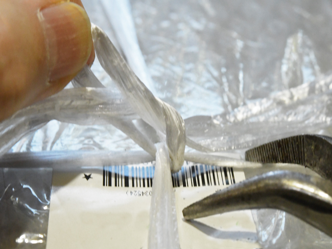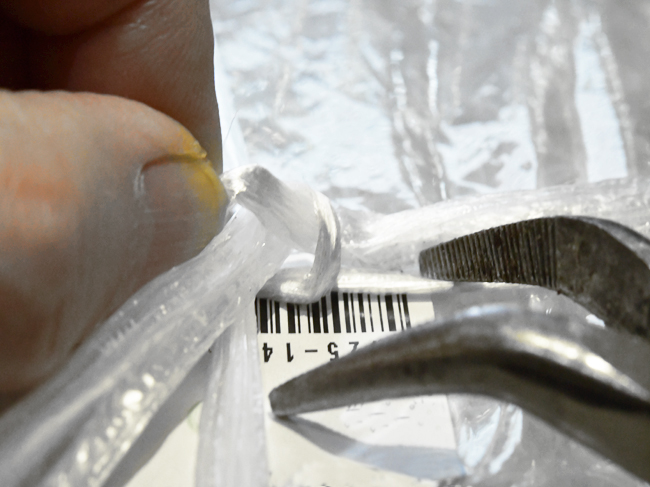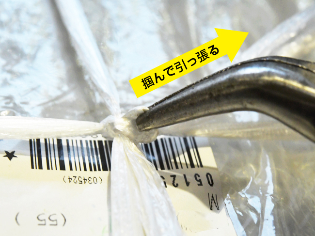 紐結びは、用途によって結び方が違います。をもう解かない結び方、一旦纏めといてまた解く結び方結んだ後に結び目がスライドする方法など様々なものがあります。しかし、一般的に使われているのはいわゆる「固結び」、靴紐などでは「ちょう結び」です。 ビニール紐の結び目を解く フラットな柔らかいビニール紐は、何かを纏める時にとても便利です。しかし、一旦硬く結んだ時には滑って解けなくなってしまいます。普段は爪を利用して、結び目の一部を掴んで揺すりながら引っ張るとなんと!解けてきます。しかし、ビニール紐の場合は滑りますので、ラジオペンチの様な先が細いギザギザが付いた工具がると、解くことが出来ます。この時も掴んだら、揺すりながらゆっくり引っ張る動作を繰り返すと画像の様に緩んできてヒモを解くことができます。これなら紐を捨てることなく再び利用することができます。