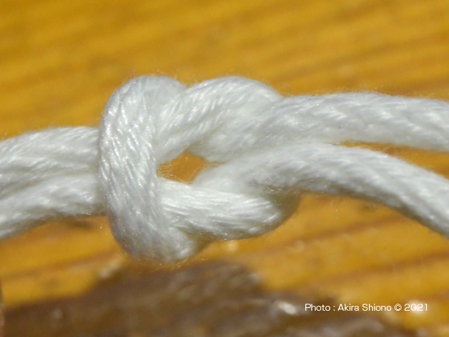 ![]() 紐をを回して十字に掛けます。このままだと直ぐに緩んでしまうのでわざと離れた箇所で十字に掛けます。 ![]() ![]() 余ったヒモの10cm位上で固結びをして、右の写真の様に結び目の位置に回してさらに結びます。 〔注意点〕張ったヒモは弾くと音が出るくらいの状態になっていれば、まず緩むことはありません。 特に持ち上げて移動しようと思ったら、歪んで崩れる可能性が出てきます。ビニール紐はとても便利な品ですが、少しフワフワに作られていて、一旦結んでしまうと締まってかんたんには解けなくなってしまいます。 硬く締まった結び目をどうやって解くか? トップへ