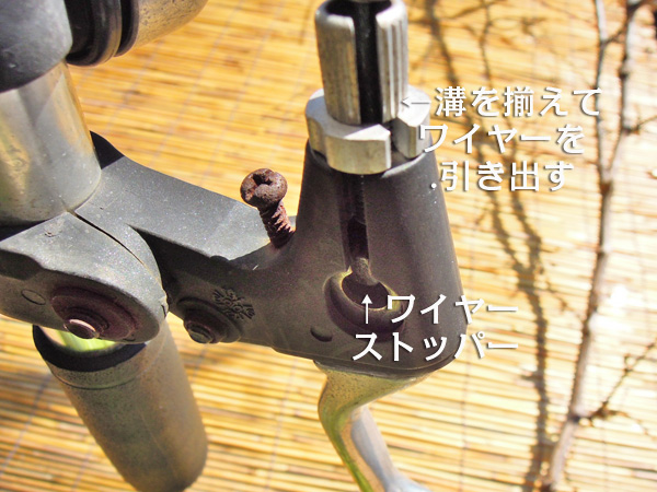 ワイヤーの端がボサボサで抜けない場合は、ブレーキ側でカットするとスムーズに引き出せます。引き出す前にワーヤーが通っている箇所を覚えておくか、デジカメで撮っておきます。レバーはメーカーやグレードによって形状が違いますし、ワイヤーエンドの止め方も様々です。このレバーはレバー側ストッパーが可動式になっていて、抜きにくかったのでワイヤーを引き出し外し易いようにします。