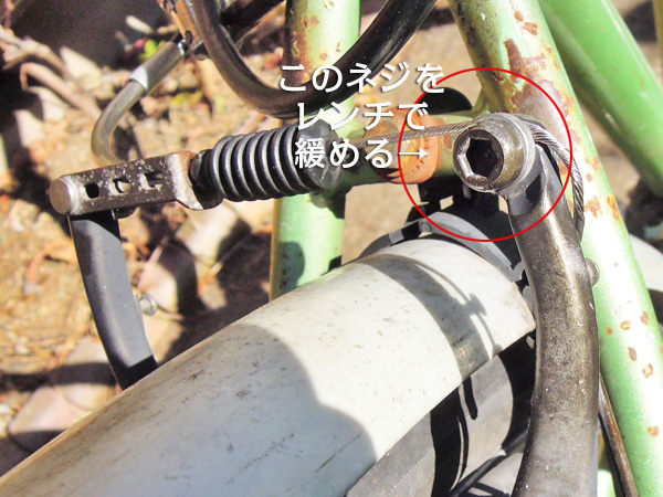 - ワイヤーは段々伸びてきますので、ブレーキレバーのワイヤーアジャスターを一杯に締めておきます。
