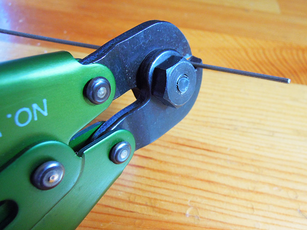 ワイヤーカッターでカットするとアウターに通しやすいです。ブレーキにセットしたら保護キャップを付け潰します。