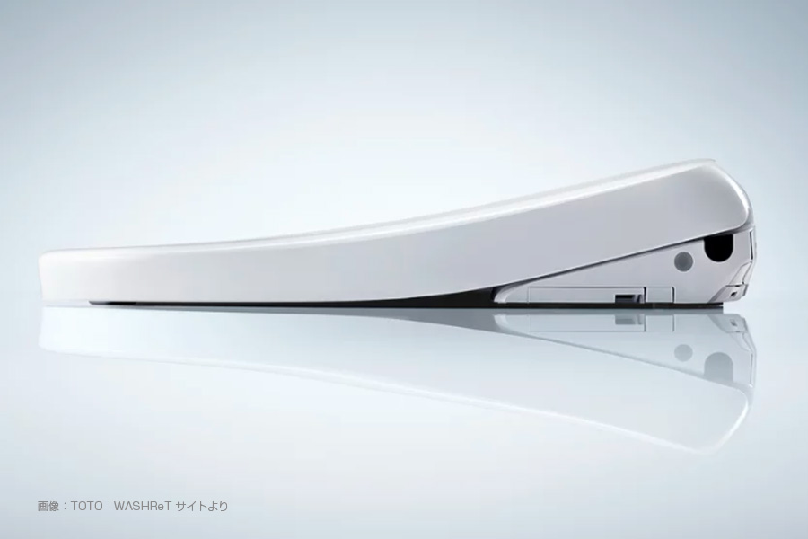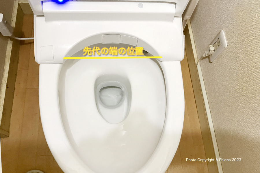 以前のウォシュレットと比べ、便座のベーズの便器側の形状が以前は左右の両端を結ぶ様な直線になっていましたが、この2023アプリコットは便器の後ろ縁の形状に沿って作られています。今までは、便器の着座の後ろに当たる部分に汚れが入ってくる構造になっていましたが、弧を描いたこの形状が跳ねがあっても隙間には行きにくい構造に改善されたのかもしれません。