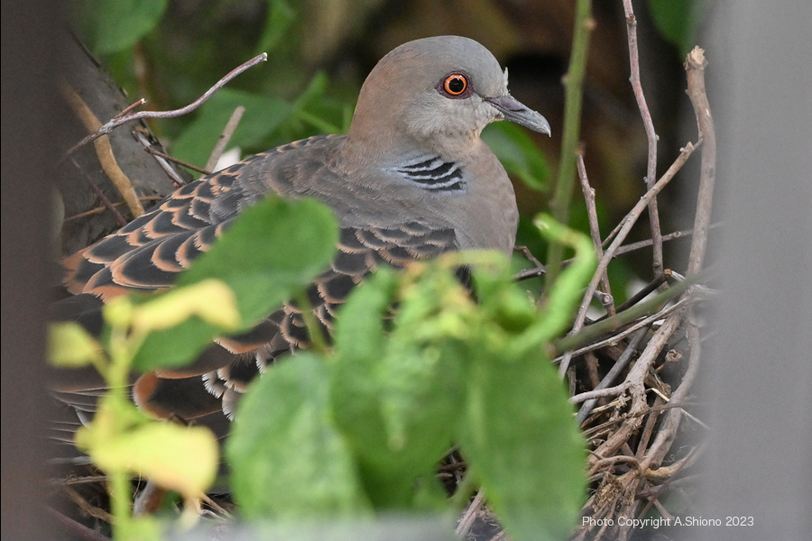 6月に入ると野鳥の餌になる生物(昆虫幼虫等)が増え各所で子育てが始まります。キビタキのウロでの子育て、池ではカイツブリやカルガモの子育てを目にしましたが、今年は5年ぶりに庭の梅の木にキジバトがやってきている様でした。 ![]() 窓の隙間から撮影した、小枝の巣に腰を下ろすキジバト。 撮影:NIKON Z9+FTZ+AF-S70-200mmf/4G VR f/13 FX:Lサイズ160mm ISO 2000 1/200 f13 -0.3段 3倍トリミング手持ち撮影 キジバトの寿命は10〜20年だったらここ生まれ? トップへ 2014年のキジバトの子育てが行われましたが、キジバトの寿命は10〜20年と言われているので、もしかしたら、この木で生まれた9歳のキジバトかもしれません。巣立ち後数年は2羽のキジバトがこの木を懐かしむ様に訪れていました。もしその時の鳩だったら9歳と思われます。9年立てばその時と枝ぶりが変わり鳩も巣作りのとても苦労している様でした。なぜかと言うと、枝の二股に解い小枝を渡して巣を作るので、前の場所にはできない様でした。 ![]() 窓から近い位置に巣を作ったので小さな音に警戒します。 撮影:NIKON Z7+FTZ+AF-S70-200mmf/4G VR f/13 FX:Lサイズ180mm ISO 125 1/200 f4 0段 3.5倍トリミング手持ち撮影 悪天候から守ってくれる 葉が生い茂る木 トップへ