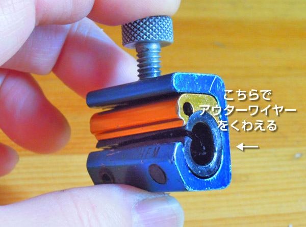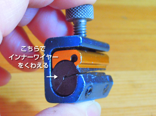 インナーワイヤーを細い穴の方に通し、アウターワイヤーを太い方にはめ込みネジを閉めます。CRCなどで綺麗にしてからオイルスプレーします。