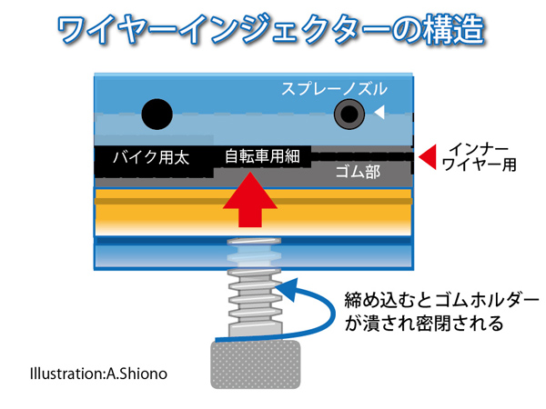 ワイヤーインジェクターを使って軽いレバー操作 トップへ 自転車で大切な部品であるブレーキワイヤーは、アウターワイヤーの中にインナーワイヤーが通っています。長年使っている間に、アウターワイヤーとインナーワイヤーの間にゴミが入ったり、オイルの粘度が悪くなってスムーズに動かなくなっている場合があります。これがレバーの戻りを悪くしています。これを解決するにはワイヤーを交換すれば改善されますが、ササクレしていなく、まだ使える場合はワイヤーインジェクターを利用すると滑りがとても良くなります。 スポーツ自転車やマウンテンバイク等に使われているVブレーキには、通称「バナナ」と言われる曲がったパイプが使われてその中にインナーワイヤーが通っています。この場合、はブレーキを解除して、ワイヤーをCRCやパーツクリーナーで清掃したのちに、シリコンスプレーや油分を補充してあげるとジワ〜と戻っていたレバーが「カチッ・カチッ」と小気味いい音を出しスムーズに動く可能性があります。また外装変速機に向かう変速ワイヤーも雨ざらしで動きが悪くなる場合があります。サビが酷い場合はワイヤーを交換します。 ワイヤーインジェクターの構造 トップへ ワイヤーインジェクターの使い方 トップへ