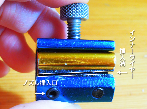 ワイヤーインジェクターは上の写真のような工具です。金色の部分の下にゴムの部品があり、この内側が2段になっています。大きい穴の方はバイクのワイヤーにも使えるようになっています。自転車用は更に奥にあります。3枚目の写真は左側が写っていますが、ゴム部分の切れ込みの中心にワイヤーの細さに合う小さい切り込み部分の端は穴になっています。 次に上のネジを締めて隙間が出来ないように、強く締めます。そしてノズル挿入口に延長ノズルを差し込み、噴射するとインナーとアウターの間に潤滑剤を強制的に圧入してくれます。ワイヤー同士の隙間から汚れが反対側のアウターワイヤーから出てきます。これで滑りが良くなります。実際に使ってみた写真を下に掲載してありますので、ご覧下さい。 ワイヤー関係のメンテナンス用品と消耗品