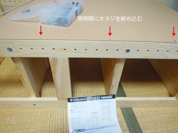 - 側板に均等に木ネジを締め込みます。