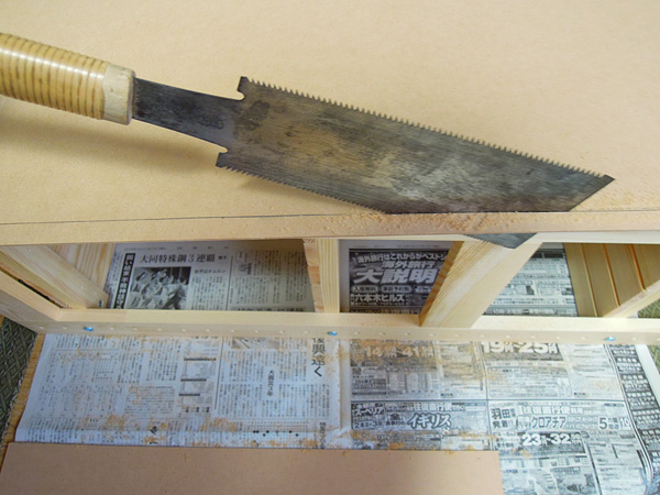 - 曲げ尺を使って棚の幅に合わせて直角に線を引き、ノコギリでカットします。
