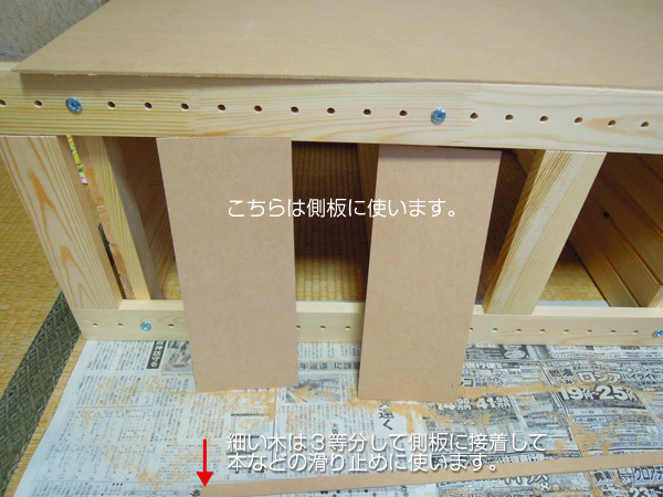 - 残ったMDFボードをカットして落ち止め側板にします。