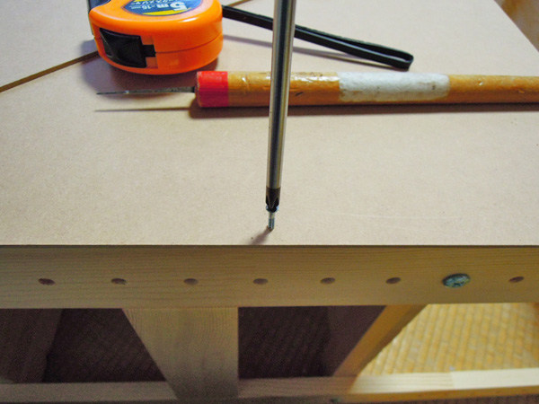 - ネジが外れないように棚板の中央を確認して、下穴をあけ木ネジをしめます。