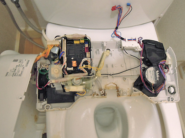 一流メーカーTOTOのウォシュレットの耐用年数は7年とされています。このトイレはリフォームをして1年と11ヶ月でウィシュレットのノズル部分が故障してしまいました。症状は、ノズルは出る物のお湯の噴射が全く無くなってしまいました。この対応策として、マッサージボタンを押したり、水勢ボタンを押してみたりしていたら、緊急時の対応としてどうにか水が出てくれました。これで時間が空いた時にTOTOメンテナンスにお願いすることにしました。 ウォシュレットの分解修理 トップへ なかなか内部を見る機会は無いと思いますが、外観の滑らかな表面と違い内部は電子部品で詰まっていました。 ウォシュレットのノズル部交換 トップへ 故障の少し前からノズルが出る時にゴッゴッゴッと小さな音を立てていたので、おそらくそれが前触れだったのでしょう。この異音が出た時は修理になる可能性があります。今回の故障は購入からの期間が短かったので無償で修理をしていただきました。おそらく部品は研究に回され新しい製品の参考になるのでしょう。対応もとても良く、さすが一流メーカーと感心させられました。 全く反応がなくなったウォシュレットは買い替え トップへ 【貯湯式 温水洗浄便座】