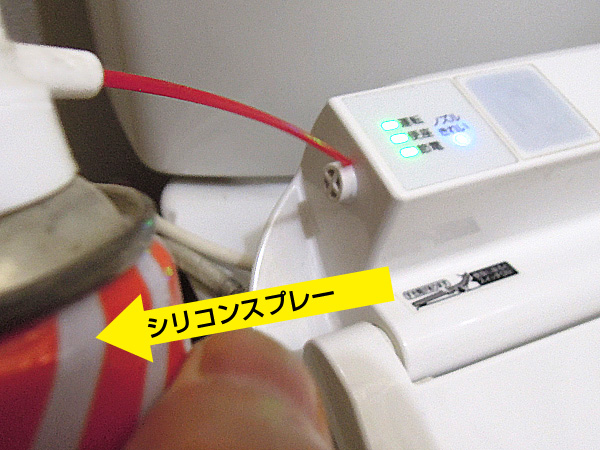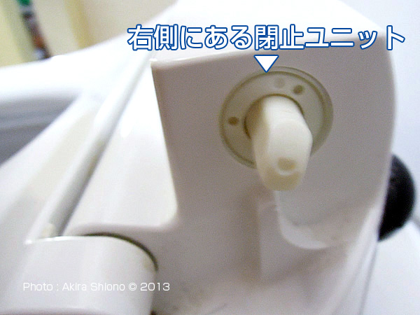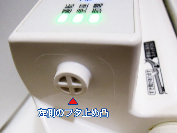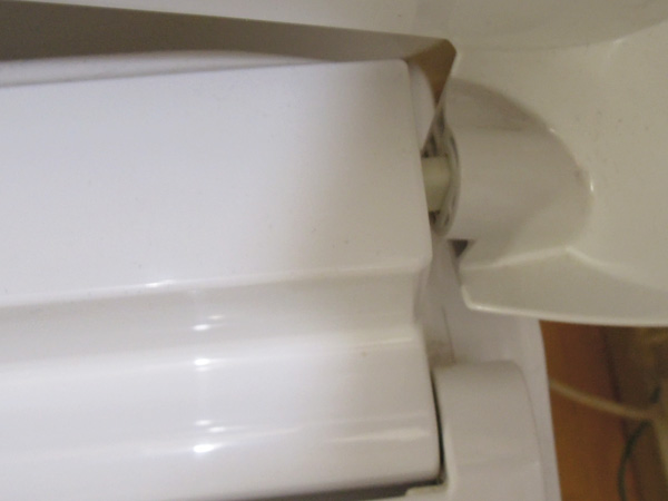 まずフタを開閉してみて、異音が出ているのがどちらかを判断します。今回の場合は、左の突起がある方でした。おそらく、摩耗してアタリが悪くなったか、成型時にあった油分が切れたのでしょう。 TOTOサービス/ウォシュレットのノズル故障と交換修理 トップへ