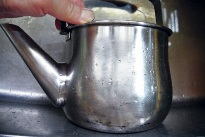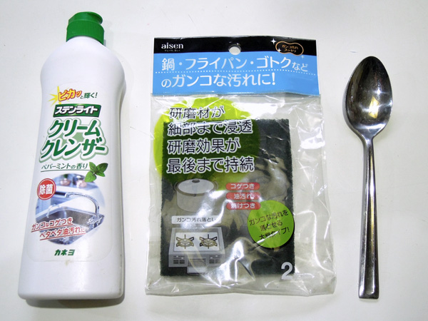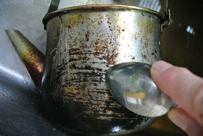 調理器具は毎日手入れをしていないと、焼き物や、揚げ物等の油が飛び散っていたりで、それを火にかけると焦げて黒くなってきます。左のヤカンの写真の様に、真っ黒焦げに分厚くなった物はかなり頑固で、焦げ落とし専用のナイロンたわしでも、なかなか落ちてくれません。 焦げ落としで使うもの トップへ 諦めないで!汚いのは表面のみです。 トップへ スプーンの掬う方でガリガリと擦りますと面白いように削れて、人によっては熱中してきます。作業には、ある程度時間がかかりますので、かがんでやっていると腰にかなりの負担がきます。楽しくやるためには、流し台の前に椅子を移動して行うと楽チンです。 これを上下左右とやってきます。ほぼ取れてきましたら、今度は焦げ落とし用のナイロンたわしを下に敷いてスプーンで擦ると早く取れてきます。注ぎ口の狭いところはナイロンたわしとスプーンの柄を組合わせて擦ります。肌理の細かいクレンザーを使うとさらに奇麗になります。 仕上げでピカピカ! トップへ トップへ移 動: 頑固な焦げ落とし 焦げ落とし用品 汚いのは表面のみ 仕上げでピッカピカ! リンク: ガスファンヒーターのメンテナンス サーキュレーターの掃除 ガステーブルの焦げ落とし CHSのIROIROサイト:人気サイト トップへ |