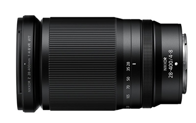 NIKONから販売されているZシリーズの400mmレンズは単焦点、ズームレンズを含むと4種類あります。2024.4.19にはNIKKOR Z 28-400mm f/4-8 VRが発売されさらに選択肢が増えました。FTZIIを装着すればFマウントの4AF-S NIKKOR 400mm f/2.8E FL ED VR等も利用できます。Zレンズでいうと、100万円オーバーの重量級と40万円前後の軽量級の単焦点レンズが各1本。その他100mm-400mmのズームレンズが出ています。 単焦点400mm f/4.5との比較 トップへ 下の画像はこの28-400mm f/4-8VRと400mm f/4.5を並べたものです。ズームレンズの方はテレ端にしてあるので長さが出ていますが、28mmに縮めると上の画像のように、かなり小型に作られています。単焦点400mm f/4.5と比較すると、重さはズームの方が725gで、400mmf/4.5は1245g(台座付)となっています。ちなみに長さは単焦点が234.5mmで28-400mmは141.5mmと非常に小型になっています。 このズームレンズの特性 トップへ