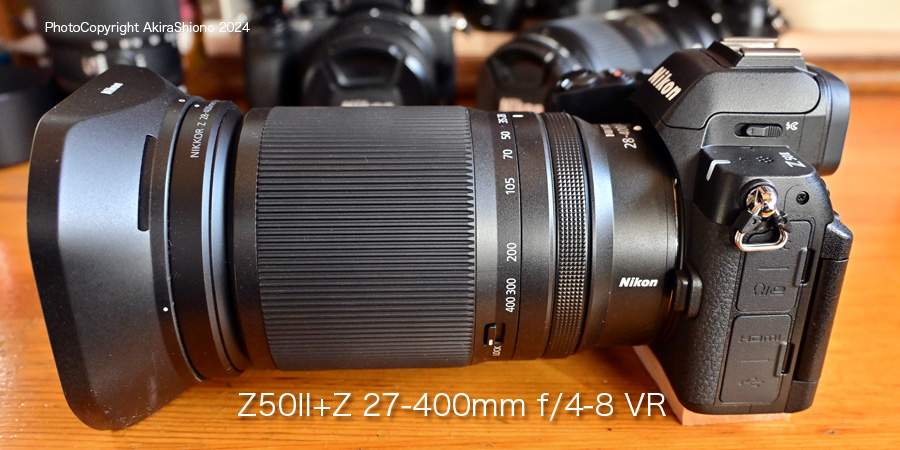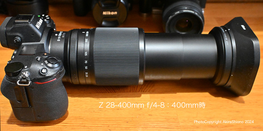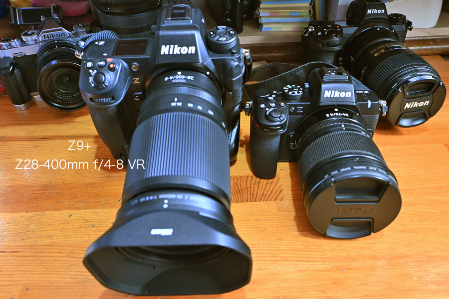 でズームしない状態だとあまりサイズは変わらない程度の差です。持ち運びに関しては幅広い焦点をカバーできるレンズです。このレンズにZ14-30mmSで14mm〜400mmの範囲をカバー出来ることになり、荷物を軽くする事が出来ます。 ![]() Z7に装着した14.2倍ズーム Z 28-400mm f/4-8 VRとZ6II+Z 24-120mm f/4 ![]() Z9に装着した14.2倍ズーム Z 28-400mm f/4-8 VRと、APSーCカメラZ50II+Z 24-70mm f/4S 4本のZ400mmを含むレンズの比較 トップへ