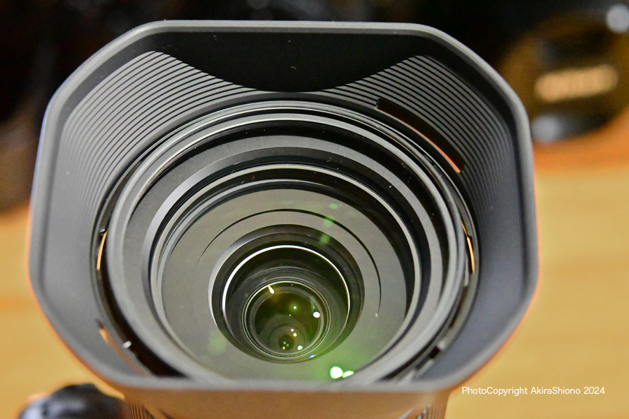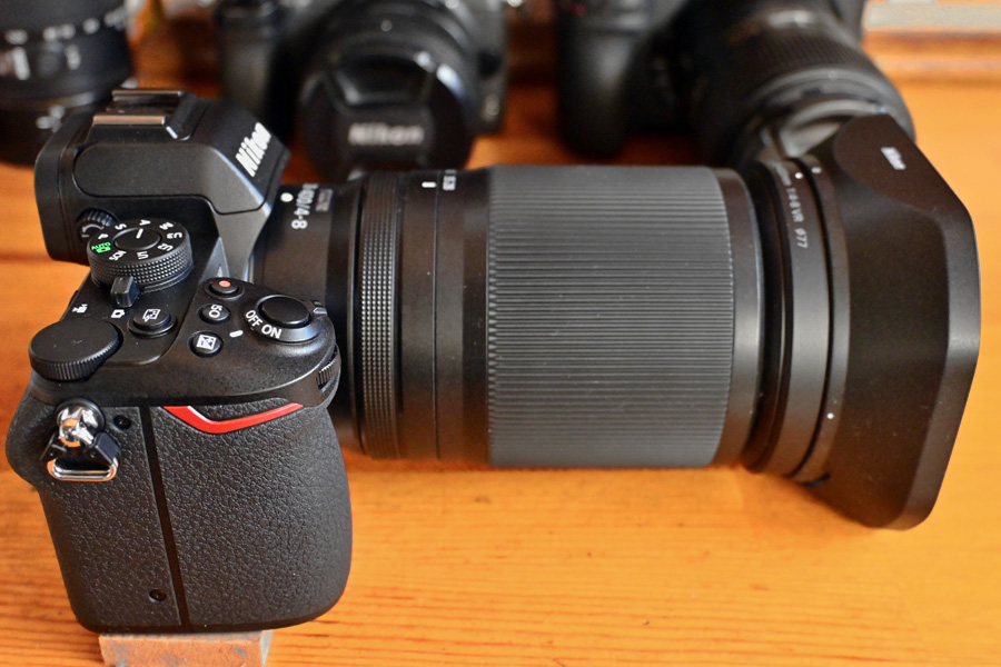 見た目はインナーズームに比べ、2段階に伸びる様になっています。これは、サイズを小型するのに必要な構造です。しかしデメリットはワイド端〜テレ端に一気に伸ばすと、レンズ外の空気をレンズに取り込んでしまいます。逆にテレ端〜ワイド端に縮めると空気が排出されるのを感じます。 ![]() Z50IIに装着した14.2倍ズーム Z 28-400mm f/4-8 VR (28mm時の状態) ![]() Z7に装着した14.2倍ズーム Z 28-400mm f/4-8 VR (105mm時の状態)