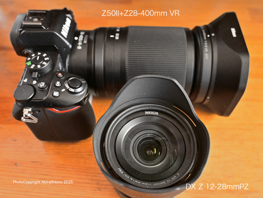 こちらは、NIKON DX(APS-C)カメラの組み合わせ例です。DXモードにすると広角側も1.5倍の42mmになり広角側が不足するので、もう1本この DX Z12-28mmを見合わせるとかなりの画角をカバーできます。対応する焦点距離は35mm換算で18mm〜600mmまで広がります。遠くの小鳥は不可能です。これだけあれば風景〜植物〜超望遠まで撮影できます。