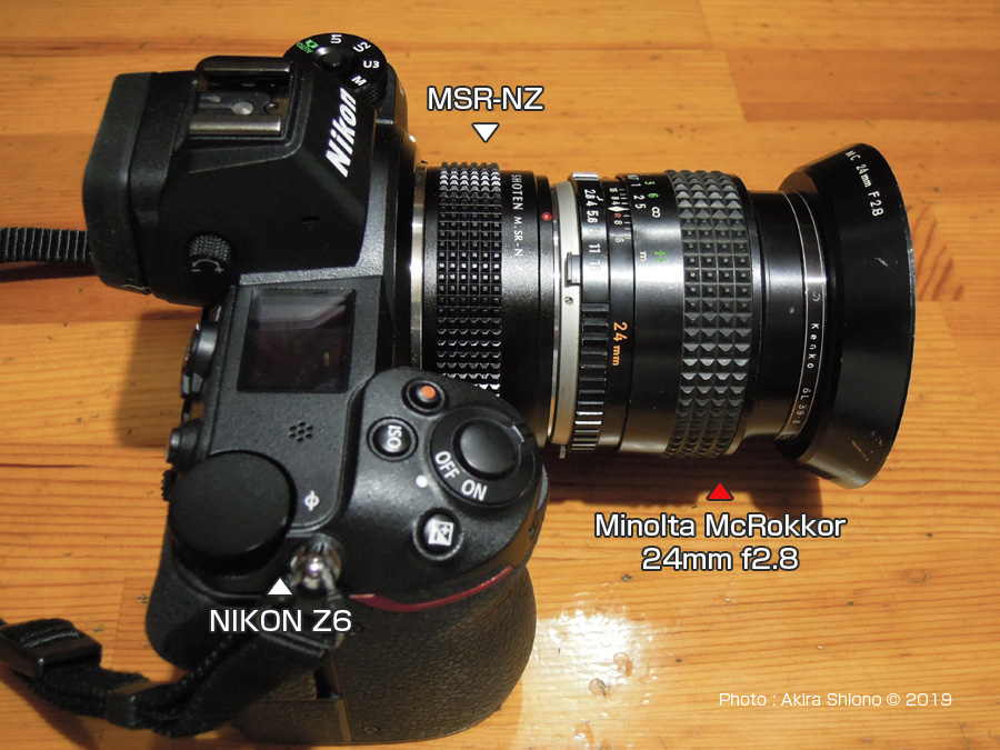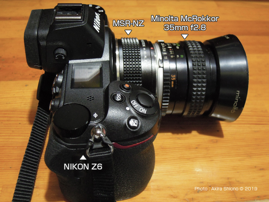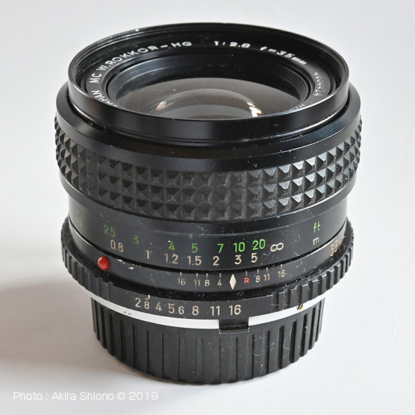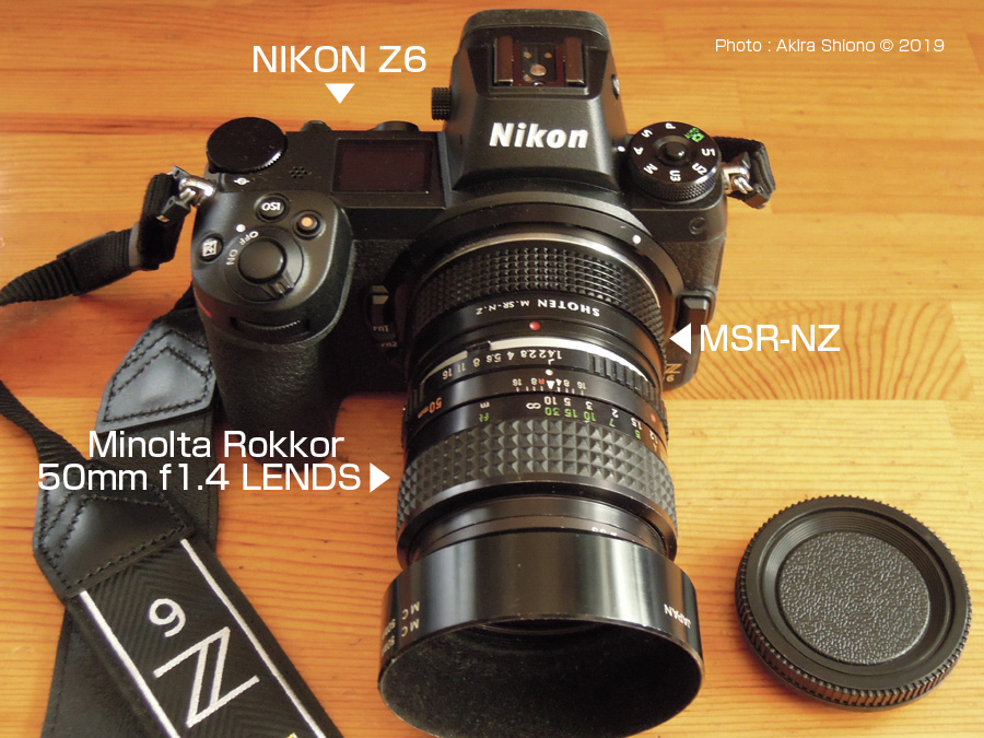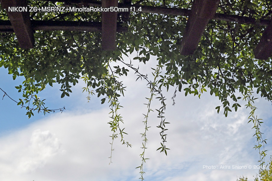 上の画像は、NIKON Z6にSHOTEN M.SR-N.Zを介して。ミノルタのMCロッコル50mm f1.4を接続したものです、画角は47°で自然に近いレンズです。MC50mmはレンズの明るさはf1.4、f1.8と2種あり、58mmがf1.2というラインナップで真ん中のグレードとなっています。自然が描写力が人気のレンズでした。このころのレンズは筐体が軽合金で、フードもアルミ合金の絞り出しでつくられていて、現在の樹脂製のフードと比べると高級感がありますが、強く打つけると歪むことがよくありました。ちなみにフィルター径は一部の望遠・超広角を除き、殆どが55mmで統一されて、フィルターの使い回しができました。