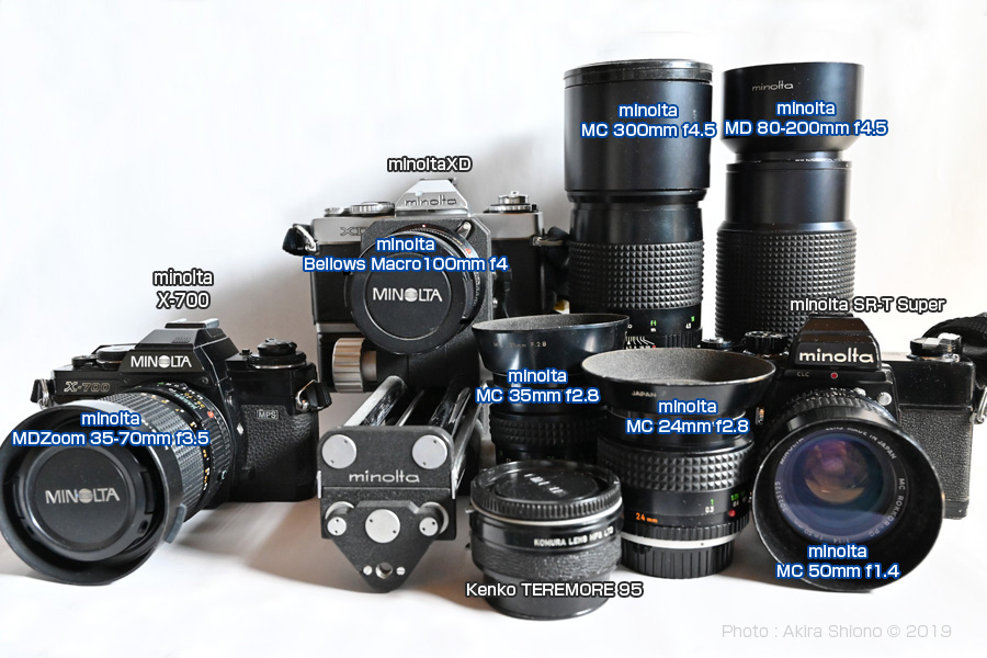 Minoltaはレンズのオートフォーカス化で、取り残された「不変のSRマウント」は時代の流れに逆らうことができず、「αマウント」へと進化しました。ここで時代に取り残されたミノルタ「SRマウント」のレンズは、出番が無くなってしまいました。カメラの大きな変化にマニュアルフォーカスは低く評価され、二束三文の価値になってしまいました。その後ミノルタの一眼レフカメラの主流は、世界初のオートフォーカス一眼レフカメラ「α7000」などに取って代わりました。その後ミノルタカメラはコニカと合併し、後にカメラ部門は現在のソニーのカメラ部門に受け継がれています。現在のαシリーズは、ミノルタの技術が根底にあったといえます。 OLDレンズの接続と撮影方法 トップへ オートフォーカスが出る以前のフィルムカメラの撮影は、以下の様な手順になります。