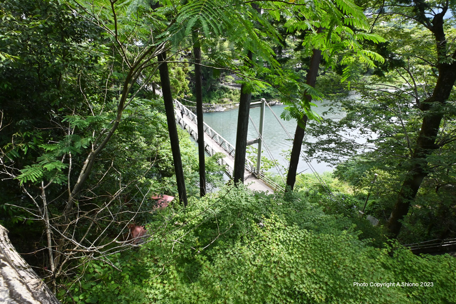 御岳渓谷遊歩道辺りの入口は、沢井駅を下り青梅街道向こう側にあるの澤乃井園(澤乃井ガーデン)に約400m向かったところにあります。こちら側は小澤酒造が経営している澤乃井ガーデンがあり、吊り橋と清流と四季折々の景色を楽しむことができます。ここから遊歩道への道は、楓橋入口のすぐ脇に北路に入れます。こちら側は寒い時期は日当たりが良いのですが、夏場は陽を遮るものがないのでかなり暑いです。こちらは川沿いは崖場が多く、遊歩道の幅も場所によっては1.2mくらいしかないのですれ違いには譲り合いで安全に通って欲しい場所です。 寒山寺展望台から楓橋を望む 2023.6.18▲top ![]() 寒山寺展望台から見た多摩川の楓橋 NIKON Zfc+ZDX12-28mmf/3.5-5.6VR 12mm ISO 640 1/100 f/16 0段 ![]() 寒山寺から御岳渓谷遊歩道の南路へと続きます NIKON Zfc+ZDX12-28mmf/3.5-5.6VR 12mm ISO 2800 1/60 f/13 -0.3段