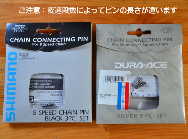 一番上はSHIMANOの外装変速機用のチェーンで6,7,8速用でこの製品は幅広く対応しています。2段目はSHMANOの9速用でチェーンの幅がHG50の6,7,8速用より狭くなっていて他の段数では使えません。さらに狭くなっているのが一番下のULTEGRAと書いてある箱のチェーンは10速用で、9速よりさらに狭くなっていて、これも10速専用になっています。こちらのチェーンは長さがありますので、分からないときは長めを買ってカットします。 チェーンを選ぶ・カットする・つなぐ
