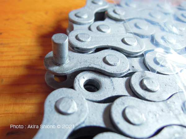 ![]() チェーンコネクターの部品は3つ。コネクティングピンと違い、やり直しがきく コネクター