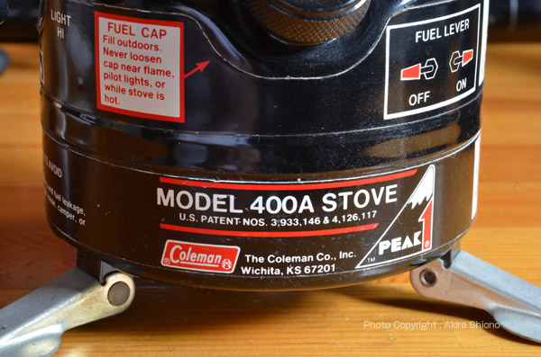 こちらの400は、製造が1984.8で同じく2レバー式が受け継がれています。この400系は現在フェザーストーブという名前で受け継がれています。折りたたみ脚とバーナーボウルは同じような形をしていますが、調整レバーは構造が単純な1つになってしまっています。 シングルストーブは、現在コールマンでは6タイプありますが、気温に左右されないガソリンストーブは、取扱いの難しさから人気が今ひとつで2タイプのみとなっています。