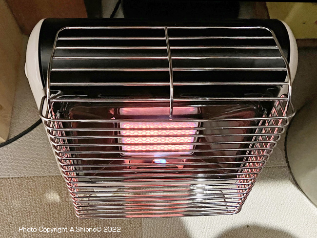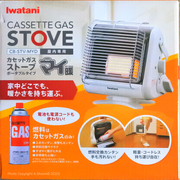 補助暖房や非常時の暖房に使えて電源や給油の面倒がない。カセットガス暖房機「iwataniCASSET GAS STOVE マイ暖」を手に入れてみました。50年くらい前の暖房は灯油ストーブがメインでした。確かにローコストで暖かい暖房でした。しかし点火時の匂いや今はないと思いますが、昔はストーブに直にポンプで給油していましたので、溢れて溢れたり余りいい思い出がありませんでした。一番お手軽なのは電気暖房機ですが、消費電力が最大1200W位と沢山の高電力消費の家電を同時に使うと、場合によってはブレーカーが落ちる問題が出て来ます。例えばセラミックヒーター1200w、エアコン起動時1400kw、電子レンジ1000W、ドライヤー1000Wなどです。これに対してガスファンヒーターは、面倒のないとてもいい製品ですがガス栓の無い部屋では使えません。こんなことから、補助暖房や消費電力が大きいセラミックヒーターの代わりとしてトイレや脱衣場などの暖房にもコンパクトに使用できるので便利です。 通常時はアシスト暖房でガス消費対策