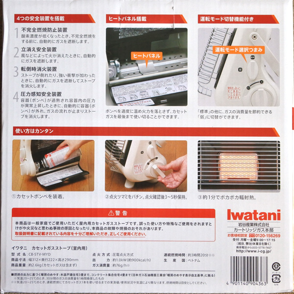 手軽に使える安全な補助暖房を考える 移 動: 室内で使えるカセットガス・ヒーター カセットガス暖房機の安全機能 Iwataniカセットガス マイ暖 iwataniマイ暖の外観 iwataniマイ暖を使ってみる リンク: 非常時の暖房を考える 部屋の加湿と暖房を考える 寒い時期にあると快適なアウトドア道具 カセットガスボンベの注意点 カセットコンロの使用期限と買い替え Colemanの携帯カイロ 非常時の暖房として室内で使えるカセットガス・ヒーター トップへ