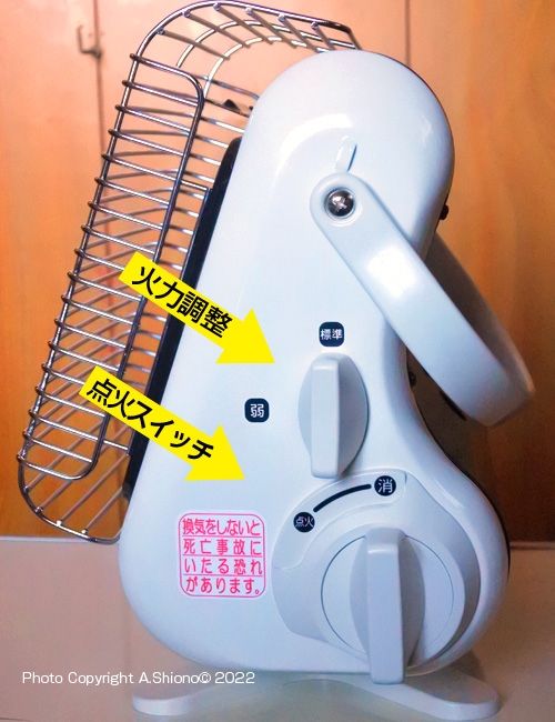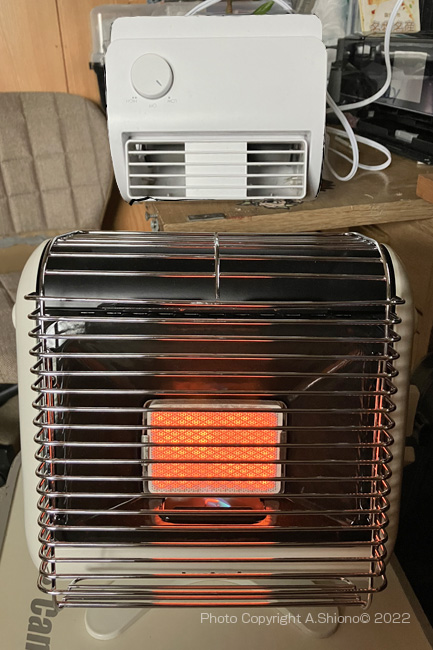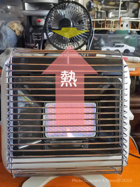 これが、この製品の外観です。右側面には、点火レバー、火力調整レバーがあり、左側には何もありません。後ろ側には、カセットガスボンベを入れる場所が下部にあります。最初は収納フタが硬く思ったより力が必要でした。カセットガスの装着は普通のコンロと同じですが、どちらかというと差し込んで金具にはめ込む感じです。フタの固定は板バネのようになっていて不用意には開かなくなっています。 iwataniマイ暖を使ってみる トップへ こちらは対流式ストーブで、石油ストーブの様な赤外線を広範囲に反射させる鏡板がついていません。正面方向は遠赤外線の温かさがありますが、省エネ対応のために燃焼面積を小さくしてあります。大半の炎の熱はバーナ部から真上の天井方向へ向かっていきます。保護ネットの中をよく見るとバーナー部の上側には燃焼面まわりと同じ素材のホーロー製の庇が出ています。この庇の役目が上部の過熱防止の為なのかもしれません。大雑把ですが、室温が20度弱の時点火したストーブの上部と前面の温度を測ってみました。上部は80.6℃に対して前面は35.5℃でした。 このストーブの活躍の場 この「マイ暖」の特性として燃焼して出る主な熱は7割方上方へ昇っていき、バーナー部前面もせいぜい40cm位離していると、いい感じで暖かいです。上方向へ昇る熱は手を温めるのには非常に効果があります。結果、このカセットストーブは、製品名の「マイ暖」にある通り足元に置いて「一人だけ暖まれますよう」 という暖房機です。4畳位の小さな部屋でも温めるのには難しい機種と判断しました。 簡易ファンヒーター:上昇する熱を前面へ送る 通常の使用では、最も高温の作られた熱は天井方向へ向かい上層へ溜まっていくことになります。この層をサーキュレーターでかき混ぜれば下方へ回って来ますが、さらに効率よく直ぐ温まる方法を考えました。 この様に、放熱式のストーブではガスファンヒーターの様に熱風が前面には来ません。上面に出る熱は上昇して天井方向へ上っていきます。 このガスストーブは、カセットガスコンロを使った場合と違い炎の勢いが沢山空いた小さな穴から放出されパネルを温める為にあるので、勢いが弱いです。 これをより効率よく前方向へ向かう様にするには、風が緩やかな小型のUSBファンが使えそうです。ここでは熱風が上昇する、底面から25cm位の高さにUSBファンを載せています。ストーブに点火して温度が安定してからファンを回すと、今までは殆ど天井方向に向かっていた発生した熱が、ファンヒーターの様に緩やかに前方向に流れて来ます。ただし風量は緩やかな方が適しています。これでかなり効果的に熱を利用できると思います。 移 動: 室内で使えるカセットガス・ヒーター カセットガス暖房機の安全機能 Iwataniカセットガス マイ暖 iwataniマイ暖の外観 iwataniマイ暖を使ってみる リンク: 非常時の暖房を考える 部屋の加湿と暖房を考える 寒い時期にあると快適なアウトドア道具 カセットガスボンベの注意点 Colemanの携帯カイロ CHSのIROIROサイト:人気サイト トップへ |