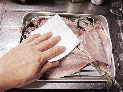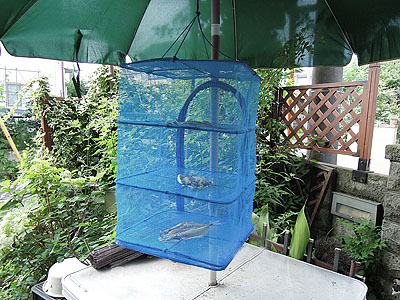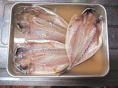漬け込む液体は、幾らかでもおいしくなることを期待して「梅干し作り」の時に使用した、海水で作られたミネラル等が入っている自然塩の「あらしお」を使いました。塩の分量は1Lに対して大さじ6杯位を使用しました。溶けを早くするには1Lのペットボトルに塩を入れ、強く振るといいです。この漬け込み液を4号のアルミバットに入れました(このサイズだと中3尾がギリギリです。当然ボールOK)。漬け込みは1時間半にました。 干す前の下処理と天日干し トップへ