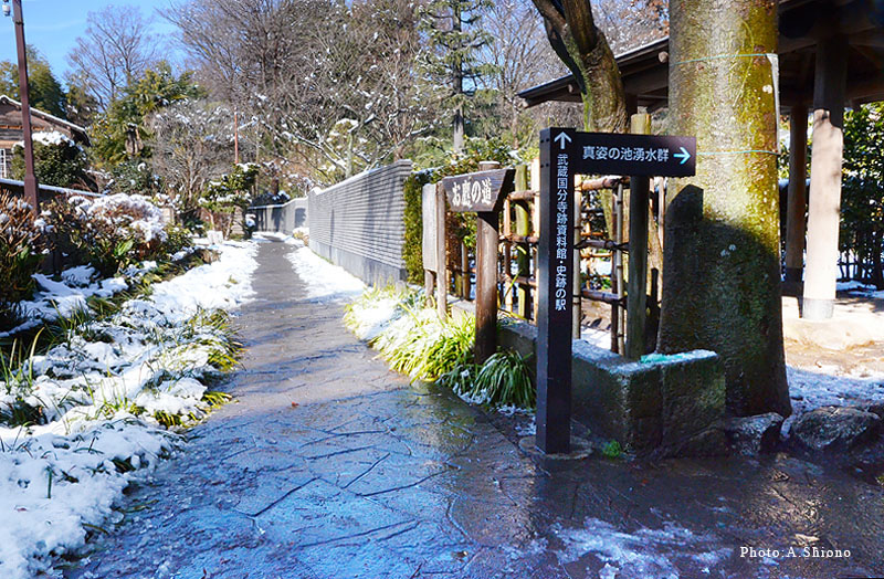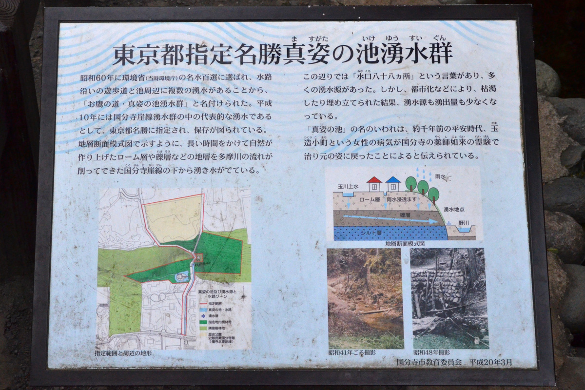 お鷹の道と国分寺崖線から湧き出る清水 お鷹の道の由来 トップへ 江戸時代に市内の村々は尾張徳川家の御鷹場に指定されていました。それにちなんで、崖線下の湧水が集 まり野川にそそぐ清流沿いの小径を“お鷹の道”と名づけ、現在約350メ−トルを遊歩道として整備されています。四季折々の散策路として人気がありますが、春から初夏にかけて沿道に見られる「カラー」の花も人気の一つです。沿道沿いの街並みとともに、国分寺を代表する名所として親しまれてい ます。 国分寺市HPより 真姿の池湧水群 トップへ ![]() 真姿の池の正面の真姿の池湧水の湧き出し口と説明板 上の写真はお鷹の道の真姿の池の入り口で、右手(入り口左側)に東屋(休憩所)があります。「お鷹の道湧水園」から流れ出たわき水が左手に流れていて、左の写真の「真姿の池湧水」から流れ出たわき水とこの場所で合流します。ここにある説明板には、国分寺崖線の上に降った雨などが地中に吸込まれ、礫層で濾過され崖線の下の方からわき出す仕組みが解り易く説明されています。この国分寺崖線の西側にある現在の武蔵国分寺の東隣にある、お鷹の道湧水園の境からも湧水が流れ出し、こちらがお鷹の道の傍を流れる水路の最西となっています。