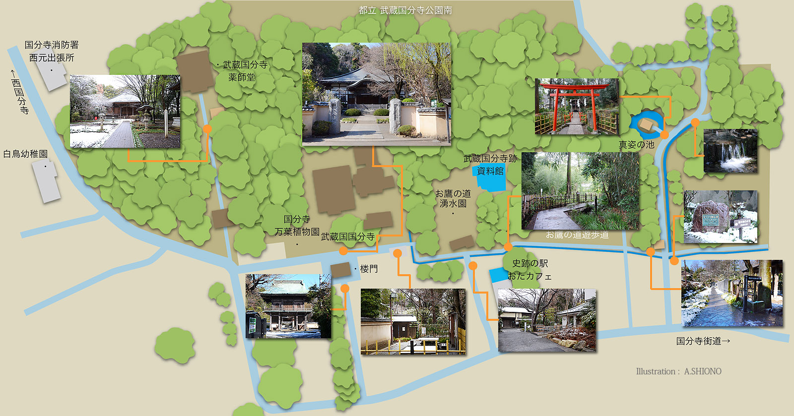 このお鷹の道湧水は、南口の坂下の府中へ向う国分寺街道の一里塚付近に流れます。そして不動橋南側で、北西にある日立中央研究所を源流とする「野川」と合流します。 休憩所は下のマップ(拡大可能1800x839pix)にある、武蔵国分寺跡資料館前にある「おたカフェ」で軽食や喫茶を楽しめます。 【お鷹の道周辺マップ】 CHSのIROIROサイト:人気サイト トップへ |