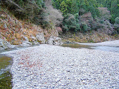いつもの場所に車をとめ支度を済ませ、河原へ降りる。途中から見える清流はやはりガラスのように透き通っていた。どうせお正月は体を動かせないので、釣れなくても今年最後の渓流歩きはメリットはある。師匠達は来年早々、魚が餌を喰ってくれる管理釣り場に行こうと云っていた。実際竿を振ってもアタリが無いのは空しい気がするのだが、清流の音、陽が出て暖かそうに感じさせてくれる景色を感じていると満足出来てしまう。先週の川井堰堤周辺の景色はかなり変化があったが、下流に行くに従って影響はたいした事は無い様に思われた。今回は先週行かなかったOFC迄のルートに決めた。
