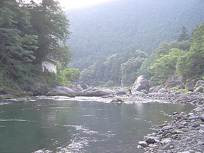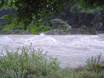 昨日(土曜)は久々に釜の淵に行ってみたが、散歩で終わってしまった。そこも、もうそろそろ平水になっていたかと思ったら相変わらず増水・濁りだった。御岳の方は少しは良くなっているだろうと、現地に到着して見ると相変わらずだった。 放流日のこの日沢井から下流はニジマスの放流があるが、こちらは人気は全く無く、無気味な感じがした。今回は手前の緩みを狙うために6.1mを持って来たのでこれに仕掛けを付ける。降り口の上流側から攻めていくが、アタリが全く無い。仕方がないので今まで釣れたポイントを攻めてみるが反能無し。そのうち御岳小橋の上から河川局の係員らしい人が私に向かって「水が増えますから気を付けて下さい〜」と教えてくれた。暫くすると大音量で「白丸ダムが放水します・・・」との放送があったので対岸に渡り、少し上まで攻めることにしたが、濁りと水量が多く(放水量毎秒16トンで通常の約3倍)釣りにならなかった。前を見ると対岸の私の釣っていた所に年輩の釣り師が支度をしていた。その後中年の釣り師がその隣の私が攻めていたポイントを大岩の上から攻めていたが釣れていないようである。 手前の緩みで竿を降っていると、やっと14cm位のヤマメが釣れた。その後下流まで行くが全くアタリもなかった。