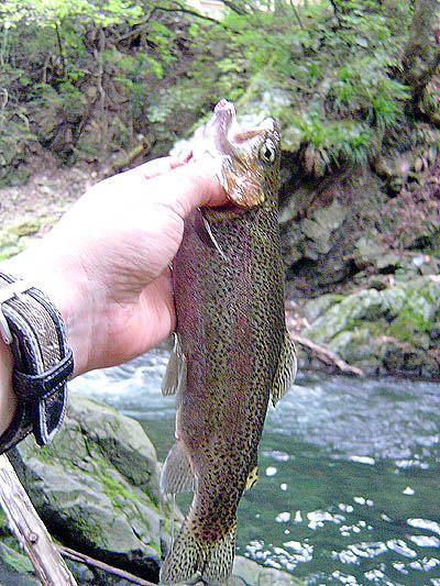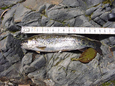 管理釣場の下流のポイントへ行く事にした。幸い、いつもの駐車場所が空いていたのでそこへ車をとめる事にした。対向車線にも1台止まっていたのでもしやと思ったが、幸いポイントには誰も居なかった。最初に下流側の崖を降り、仕掛けを付けポイントにキャストする。数投目でアタリが。なんとアブラハヤ。ここには結構多い魚だ。そのうちに目の前をポチャン!と何かが落ちた。すぐ隣を見るとルアーマンがいた。こちらは屈んでいたのでわからなかったようだ。私に気付いたルアーマンは帰っていった。アタリがアブラハヤしかこないので少し上にキャストすると今度は10cmくらいのチビヤマメだ。いくらなんでももう少し大きいのがいるはずと信念をもって数投。やっとそれらしいアタリがきた。最初は20cmくらいだろうと思っていて対応していて、近くによって来てみると立派なニジマス。竿が短く水面が低かったのでタモですくい上げた。