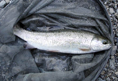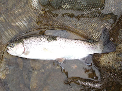 この日の延べ竿はこれ一本。今回は放流されてから2週間経っているので、02の細仕掛けで狙った。今年2回目の37cmのニジマスだった。